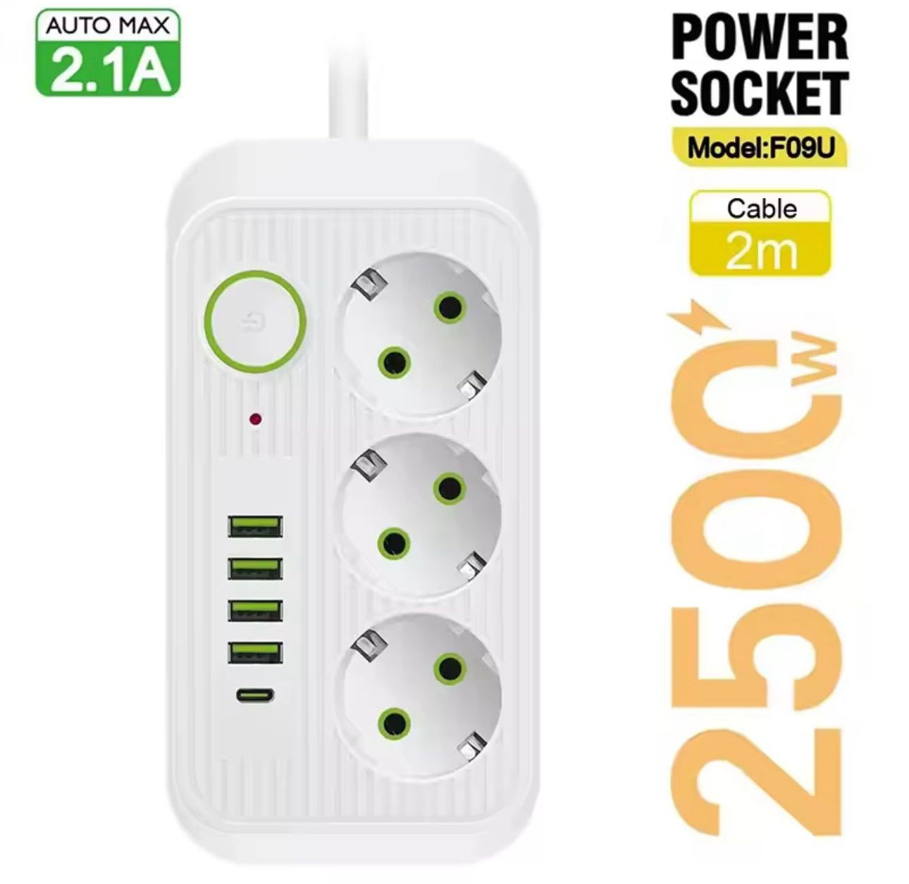 Lote de 5 regletas con 3 entradas enchufe, 4 entradas USB y una entrada tipo-C, con botón de encendido.